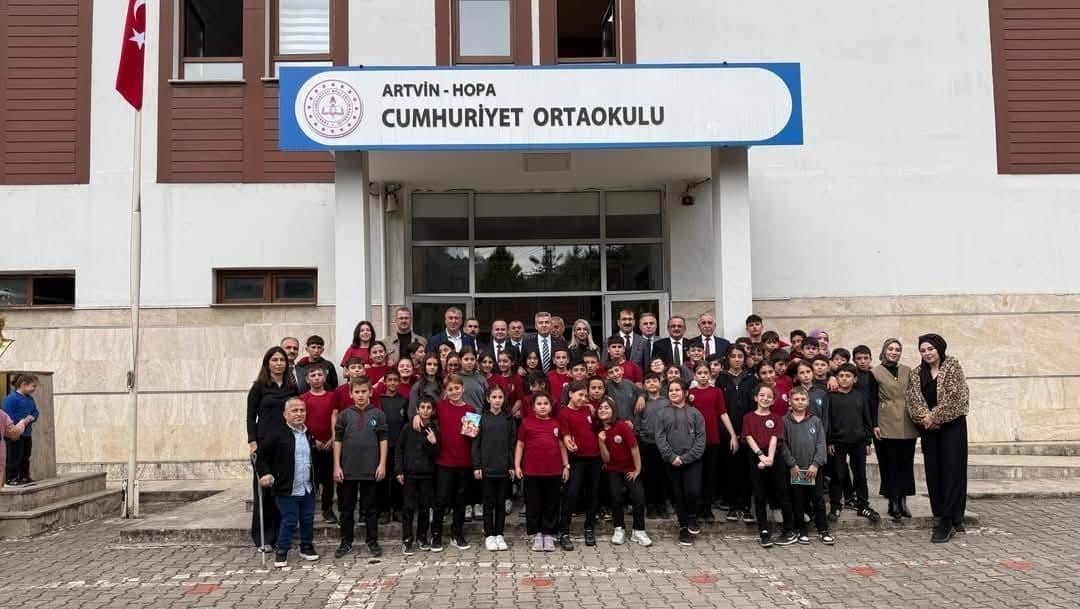 Artvin Valisi Sayın Dr. Turan Ergün, beraberinde Hopa Kaymakamı Abdullah Arslantürk, İl Jandarma Komutanı J. Kd. Alb. Uğur Başkonak, AK Parti İl Başkanı Av. Ali Semih Aydemir, İl Millî Eğitim Müdürü Fahri Acar, İlçe Millî Eğitim Müdürü Sezai Aydın ve ilçe protokolü ile birlikte Hopa Cumhuriyet Ortaokulu'nu ziyaret etti.