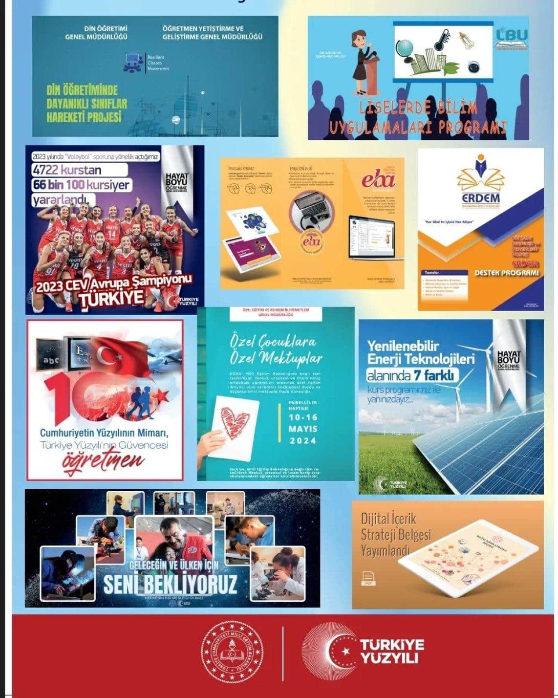 Millî Eğitim Bakanlığımızca yürütülen başlıca projelerin görünürlük ve bilinirliğini artırmak, tekrar hatırlatarak daha çok siz değerli vatandaşımızın bilgilendirilmesini sağlamak amacıyla söz konusu proje ve programların görsellerinden oluşan "afişler", hazırlanıp aşağıdaki linke yüklenmiştir.